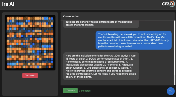 One of five myths debunked during the conference was that the complex, regulated nature of industry processes are beyond AI’s capabilities. CREO demonstrated a custom AI voice agent that was fully capable of interacting with clinical protocol documents, clinical trial management systems, and EDC data repositories to address a wide variety of research needs with 100% accuracy. Offering protected access to enterprise data repositories, the agent was also able to dynamically solve puzzles presented in the retrieved data, demonstrating AI’s extensibility far beyond traditional clinical systems and biostatistics.